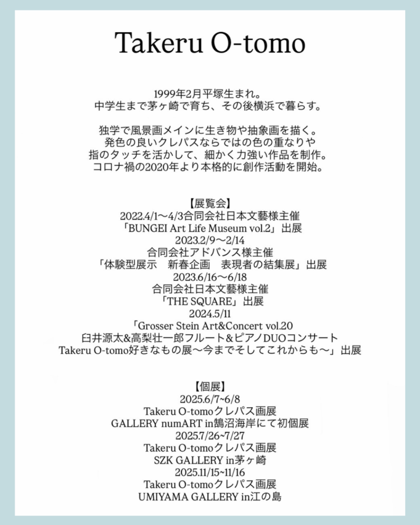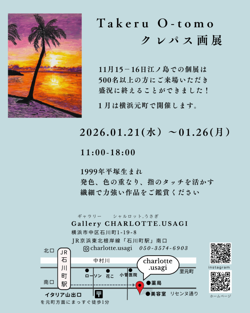 お知らせ1/21-26 Takeru O-tomo クレパス画展 Play Pause Unmute Mute galerist tete2025年11月21日 Share: Facebook X 1月21日(水)〜 26日(月)Takeru O-tomo クレパス画展11:00-18:0011月15−16日江ノ島での個展は500名以上の方にご来場いただき盛況に終えることができました!1月は横浜元町で開催いたします。
